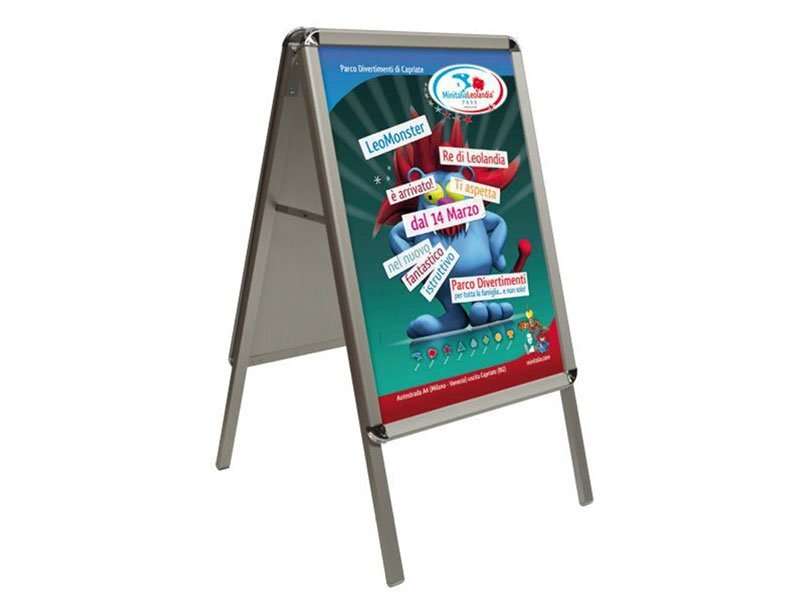 Il cavalletto bifacciale in alluminio è un espositore versatile e resistente, dotato di sistema di fissaggio a scatto che permette di inserire e sostituire le stampe in pochi secondi. Ideale per uso interno ed esterno, è progettato per comunicazioni promozionali chiare e ben visibili.