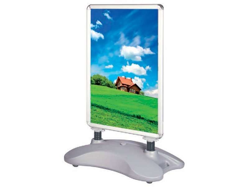 L’espositore antivento bifacciale è una struttura robusta progettata per l’uso esterno, dotata di molle antivento che garantiscono flessibilità e resistenza alle raffiche, e una base riempibile con acqua che assicura massima stabilità. È ideale per comunicazioni ad alta visibilità in ambienti esterni, anche in condizioni meteorologiche avverse.